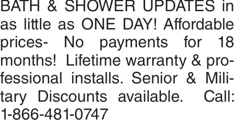 BATH & SHOWER UPDATES in as little as ONE DAY! Affordable prices- No payments for 18 months! Lifetime warranty & professional installs. Senior & Military Discounts available. Call: 1-866-481-0747