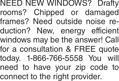 NEED NEW WINDOWS? Drafty rooms? Chipped or damaged frames? Need outside noise reduction? New, energy efficient windows may be the answer! Call for a consultation & FREE quote today. 1-866-766-5558 You will need to have your zip code to connect to the right provider.